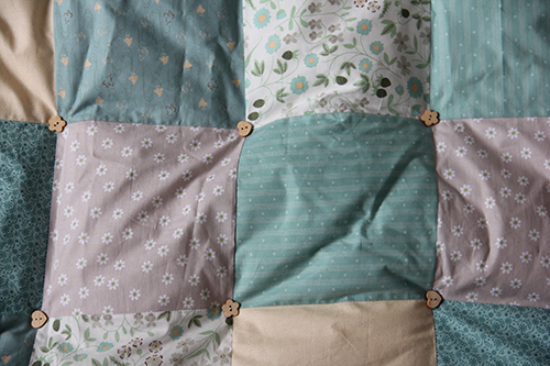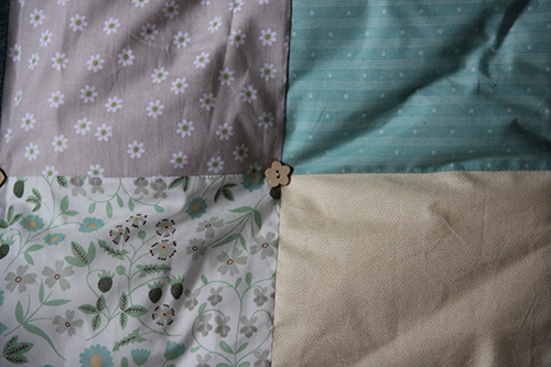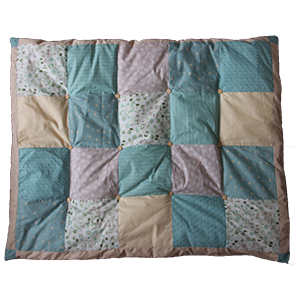 Dimensions 90*110cm, dessus 100% coton, tissus liberty, japonais, patchwork. Dessous: tissu polaire. Boutons en bois.
