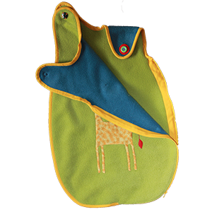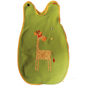 Gigoteuse taille 0-6 mois, 100% polaire, bicolore (un côté vert, un côté bleu). Les coutures sont toutes invisibles et recouvertes pour un parfait confort de bébé. Pressions sur les rabats.