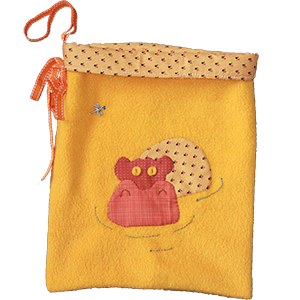 Sac pour ranger le pyjama! Dimensions 25cm x 32cm, 100% polaire, intérieur coton patchwork. Petite anse pour l'accrocher au lit.